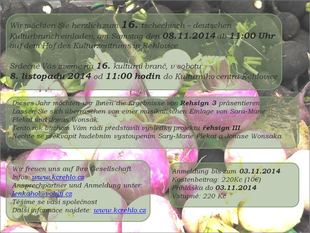 Wir laden Sie herzlich zum fünfzehnten deutsch-tschechischen Kulturbrunch ein: Am Samstag 9. November 2013 ab 11:00 Uhr im Kulturzentrum Řehlovice. Das Programm ...