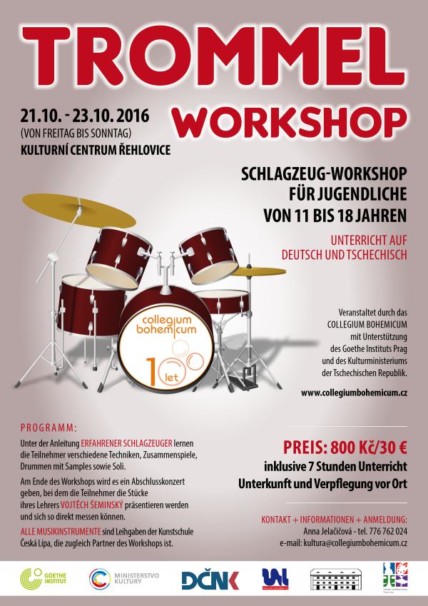 Dieser Trommelworkshop richtet sich an Jugendliche zwischen 11 - 18 Jahren und findet auf Deutsch und Tschechisch statt. Unter Leitung erfahrener Lehrer können Teilnehmer*innen die Trommeltechnik erlernen.